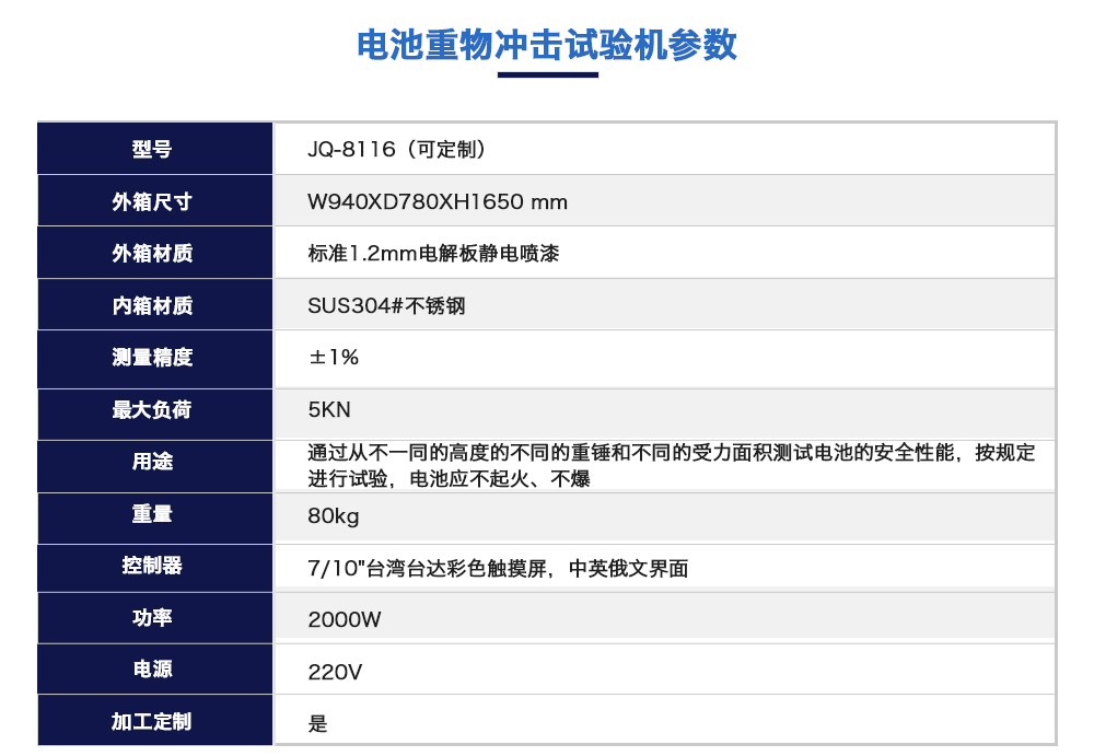 產(chǎn)品型號(hào):JQ-8116(定制款) 品牌:劍 喬 用途:電池重物沖擊試驗(yàn)機(jī)是模擬通過(guò)從不一同的高度的不同的重錘和不同的受力面積測(cè)試電池的安全性能,按規(guī)定進(jìn)行試驗(yàn),電池應(yīng)不起火、不爆炸。也是各電池廠家及研究所必不可少的檢咨詢熱線:13829135130